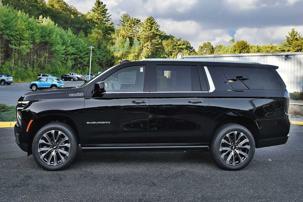 HIGH COUNTRY DELUXE includes (C3U) Panoramic power sunroof, (B3L) power-retractable assist steps with perimeter lighting, (F47) Air Ride Adaptive suspension and (NHT) Max Trailering Package, TECHNOLOGY PACKAGE Includes (NWM) Advanced Security Package content and (TCP) AutoSense power liftgate.), SUSPENSION, AIR RIDE ADAPTIVE, ENGINE, 6.2L ECOTEC3 V8 with Dynamic Fuel Management, Direct Injection and Variable Valve Timing, includes aluminum block construction (420 hp [313 kW] @ 5600 rpm, 460 lb-ft of torque [624 Nm] @ 4100 rpm) (STD), TRANSMISSION, 10-SPEED AUTOMATIC electronically controlled with overdrive, includes Traction Select System including tow/haul (STD), ADVANCED SECURITY PACKAGE includes (UTR) self-powered horn, (UTV) interior movement sensors, (UTU) vehicle inclination sensors, (UTW) glass break sensors in rear quarter glass and liftgate window and door and liftgate lock shields, AUDIO SYSTEM, 17.7" DIAGONAL ADVANCED COLOR LCD DISPLAY with Google built-in compatibility (select service plan required, terms and limitations apply), including navigation capability, connected apps, personalized profiles for each driver's settings, Natural Voice Recognition and Phone Integration (STD), ADVANCED TRAILERING PACKAGE includes (UKW) Blind Zone Steering Assist with Trailering, (PZ8) Hitch View and (UET) Smart Trailer Integration Indicator. Chevrolet High Country with Black exterior and Jet Black interior features a 8 Cylinder Engine with 420 HP at 5600 RPM*. Approx. Original Base Sticker Price: $94,600*.