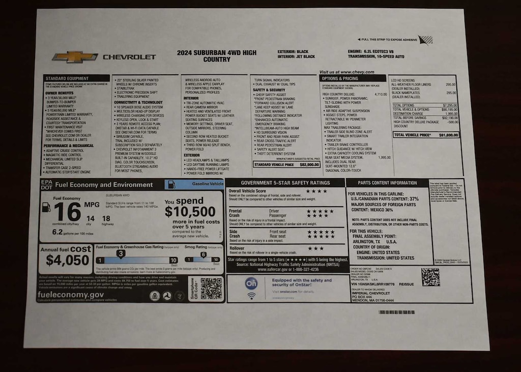 HIGH COUNTRY DELUXE includes (C3U) Panoramic power sunroof, (NHT) Max Trailering Package, (B3L) power-retractable assist steps with perimeter lighting and (F47) Air Ride Adaptive suspension, REAR SEAT MEDIA SYSTEM includes dual rear seat-mounted 12.6" diagonal color-touch LCD HD screens, two Bluetooth® headphones with 2 HDMI ports on the back of the center console, SUSPENSION, AIR RIDE ADAPTIVE, LPO, PREMIUM FLOOR LINERS, 1ST AND 2ND ROWS WITH BRAND BADGING (dealer-installed), AUDIO SYSTEM, CHEVROLET INFOTAINMENT 3 PREMIUM SYSTEM WITH GOOGLE BUILT-IN compatibility (select service plan required, terms and limitations apply), including nav capability, 10.2" diagonal HD color touchscreen, includes multi-touch display, AM/FM stereo, Bluetooth® streaming audio for music and most phones; featuring wireless Apple CarPlay® and wireless Android Auto® capability for compatible phones, advanced voice recognition, in-vehicle apps, personalized profiles for infotainment and vehicle settings. (STD), ENGINE, 6.2L ECOTEC3 V8 with Dynamic Fuel Management, Direct Injection and Variable Valve Timing, includes aluminum block construction (420 hp [313 kW] @ 5600 rpm, 460 lb-ft of torque [624 Nm] @ 4100 rpm) (STD), TRANSMISSION, 10-SPEED AUTOMATIC electronically controlled with overdrive, includes Traction Select System including tow/haul (Standard with (L87) 6.2L EcoTec3 V8 engine only.) (STD), ADVANCED TRAILERING PACKAGE includes (PZ8) Hitch View, (JL1) trailer brake controller and (UET) Smart Trailer Integration Indicator Also includes (UKV) Extended Side Blind Zone Alert.). Manager Special